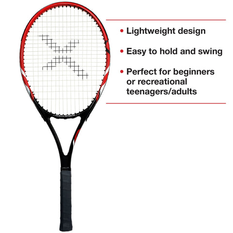 Introducing the Xcello Sports 2-Player Aluminum Tennis Racket Set, suitable for both adults and youth. This comprehensive tennis set includes two 23-inch aluminum tennis rackets designed for durability and performance. The lightweight construction ensures easy handling, making it ideal for players of all skill levels. Each tennis racket for adults in this set features a sleek red and black design, combining style with functionality. The aluminum frame provides a sturdy yet lightweight feel, enhancing your control and power during play. This set is ideal for individuals looking to improve their game or enjoy a casual match with friends. It also includes a youth tennis racket for younger players, tailored for a comfortable grip and easier swing. The balanced weight and size make it an excellent choice for youth players developing their skills and technique. In addition to the rackets, the set comes with 6 quality all-court racket balls, ensuring you have everything you need for a great game. These balls are designed for optimal performance on any surface, providing consistent bounce and durability. The set also includes two convenient carry cases, making it easy to transport and protect your equipment. Whether you're heading to the court for practice or a competitive match, the Xcello Sports tennis set ensures you have all the essentials for an enjoyable and practical playing experience. Ideal as a gift or for personal use, this set is a must-have for tennis enthusiasts of all ages.