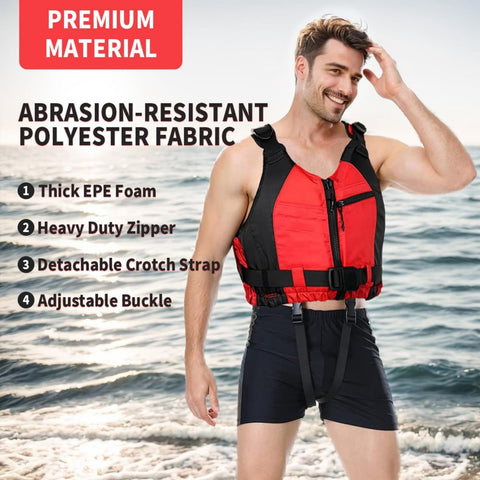 - 👍【Material】 The swim vest for adults is made of 420D nylon fabric, which is lightweight, durable and very comfortable to wear; and the stitching, zipper and buckles are solid.