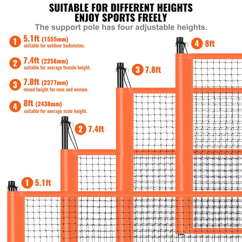 - Easily Adjustable Height: The support pole features four adjustable heights: 5.1ft (1555mm), 7.4ft (2256mm), 7.8ft (2377mm), and 8ft (2438mm), making it suitable for outdoor badminton for average height females, males, and mixed users.