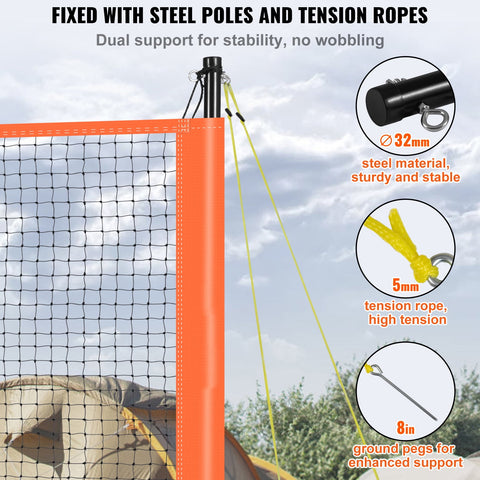 - Stable Support: The outdoor portable volleyball net system is firmly supported and stabilized by 32mm steel poles, ensuring no wobbling. Coupled with 5mm tension ropes and 8-inch ground pegs, it offers enhanced support and superior stability. You won't have to worry about it wobbling or tipping over during outdoor use.